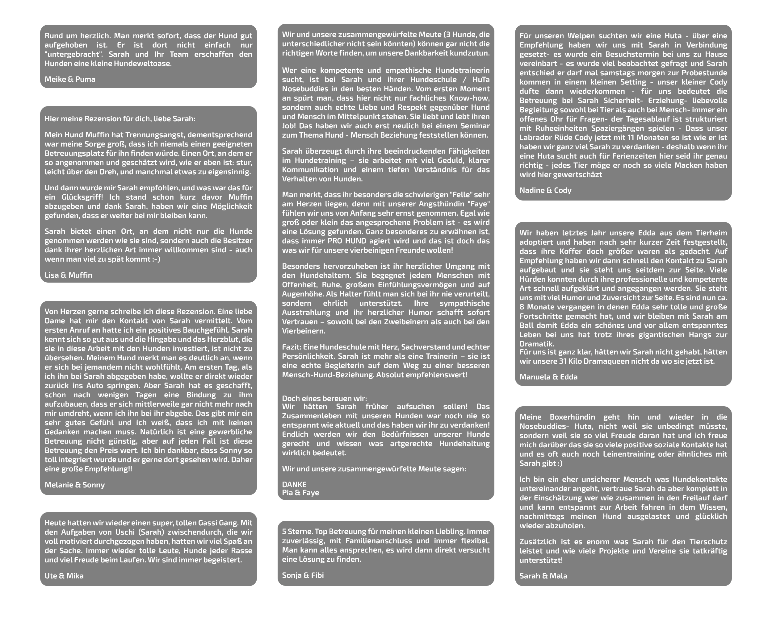 Unsere Kunden berichten von unvergesslichen Erlebnissen und vertrauensvoller Betreuung für ihre Vierbeiner.